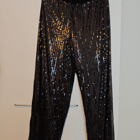 Mustat paljettihousut, haaroista sauma ratkennut ja paikattu. Olen käyttänyt, on kestänyt eikä näy käytössä.