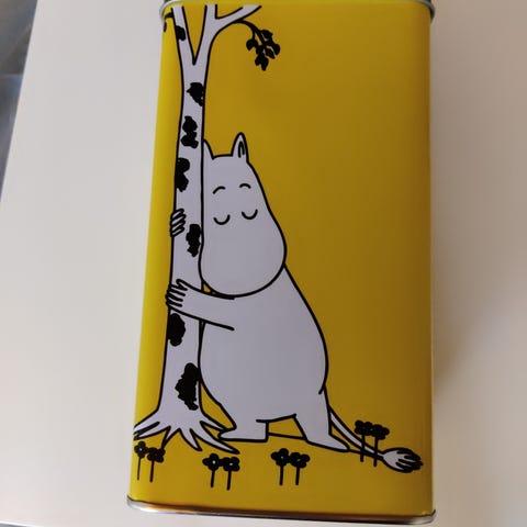 Muumi peltipurkki, halkaisija n. 8,5 cm ja korkeus n. 27,5 cm.
