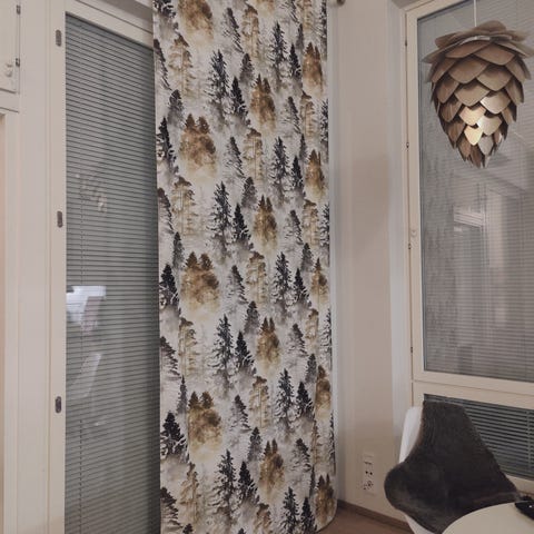 Myydään hyvässä kunnossa olevat verhot. Pohjaväri sinertävän harmaa.