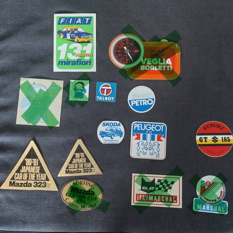 Myydään kuvan kolme Fiat tarraa ja Mazda RX-7.