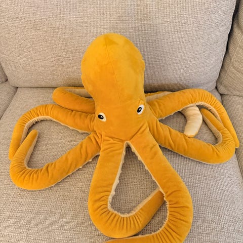 Käännettävä mustekalapehmo, vaaleanpunainen ja tummanpinkki. Lelussa kaksi erilaista ilmettä, jotka saa esiin kääntämällä mustekalan.