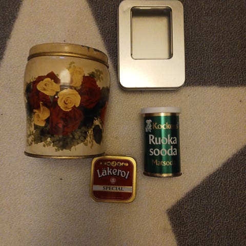 Puna-vihreä peltirasia,keksipurkki. Ruotsalaisvalmisteinen. Vain nouto.