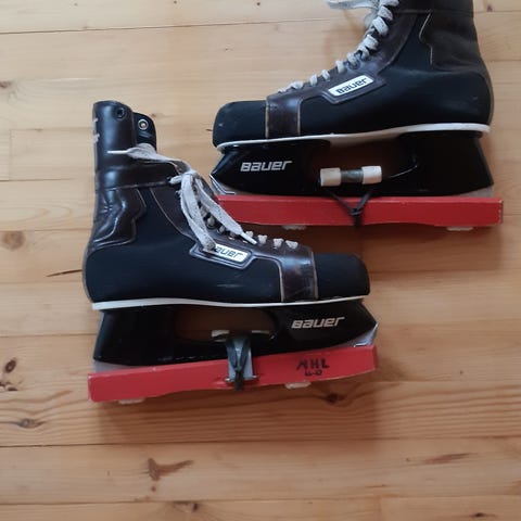 Bauer NS jääkiekko luistimet, koko on vissiin 45 en oo ihan varma. Musta ja punainen väri, valmistettu kestävästä materiaalista. Käytön jälkiä on ja narut on kerran purkautunut mutta on poltettu kiinni nii ei purkaudu enään.
