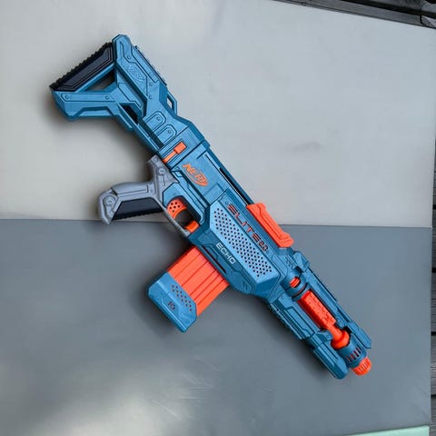 Myydään Nerf Elite 2.0 Moto Blitz. Moottorisoitu puoliautomaattinen nerf-kivääri. Sisältää aseen, 10 ammuksen lippaan sekä 16 ammusta. Ase on hyvässä kunnossa ja toimii, mutta pinnassa näkyy pieniä käytön jälkiä. Käyttää neljää AA-paristoa. Paristot eivät sisälly pakkaukseen.