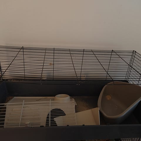 Hyväkuntoinen Ferplastin häkki 95 x 56 x 46 (korkeus) cm. Koko etuosa aukeaa. Kaupan päälle pussi purua.
