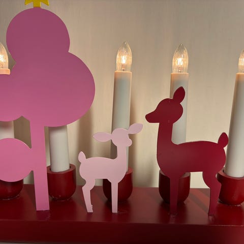 Lasten huoneeseen sopiva punainen sähkökynttelikkö,jossa 5 kynttilää. Punainen ja valkoinen peura sekä vaaleanpunainen puu koristeena,sen latvassa keltainen tähti. Johdon pituus 1,8 m, kynttelikön kork.n.15 cm, pituus n.20 cm. Vähän käytetty. Myös nouto mahdollinen Nummelasta tai Veikkolasta.