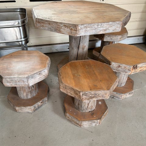Ehjät. 5 tuolia/2 pöytää/2 penkkiä. Vaatii pesun/suojaaineen. Myydään edullisesti