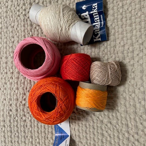 Virkkauslankoja jämiä ja kaksi täyttä. Novita Huvila ja Novita virkkauslanka.