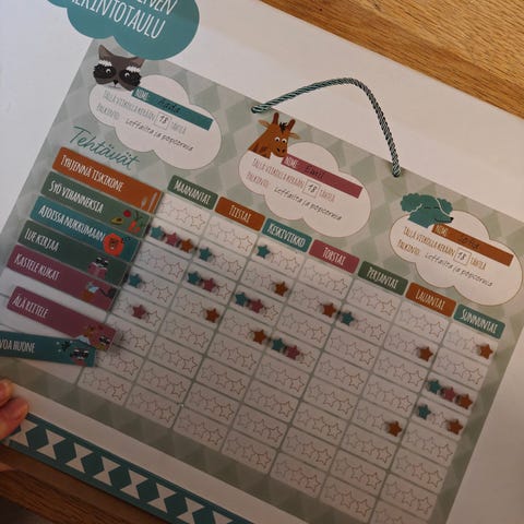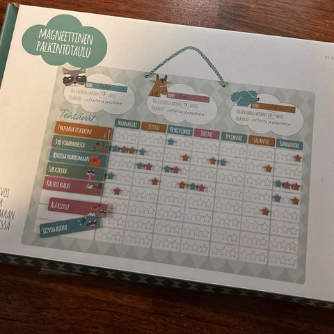Myydään lasten magneettinen palkintotaulu. Erittäin vähälle käytölle jäänyt. Kaikkia magneetteja ei ole irrotettu. Yksi tähti ja tussi puuttuu.