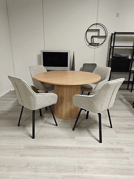 Käytetty tukeva Askon valmista ruokatuoli. Tuolissa sininen Marimekko kangasverhoitu istuin, runko valkoinen.