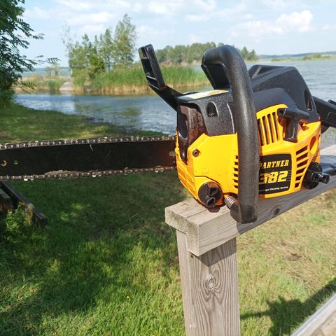 Toimiva mökkisaha, säädetty valmisbensiinille. 34cc, 2-tahti, 14". Kasattu USA:ssa.