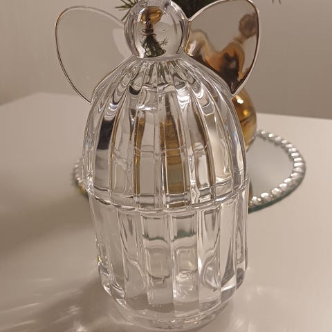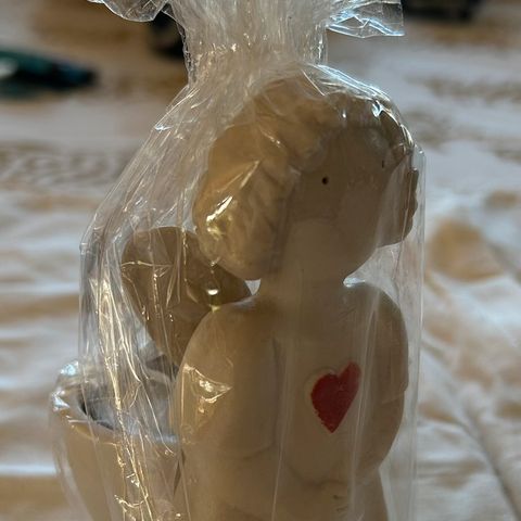 Harmaanbeige Pentikin koriste-enkeli. Korkeus noin 10. Puuta