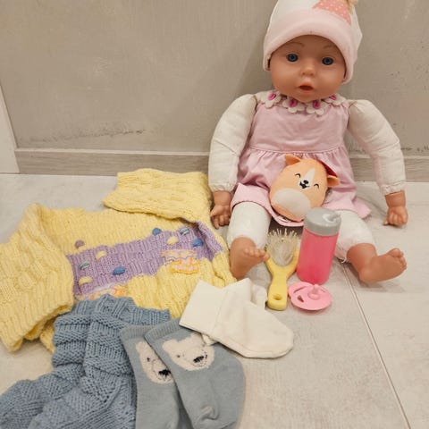 Itse neulottu harmaa villatakki ja ruskearaidallinen velour paita noin 40 cm: pituiselle nukelle .
