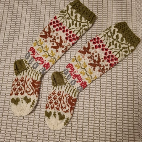 Pitkävartiset mustalla kuvioraidoitetut villasukat viininpunaisesta ja mustasta Nalle-langasta. Mitat: varsi 29cm, pohje n. 29cm, teräosa n. 23 cm (37-39).