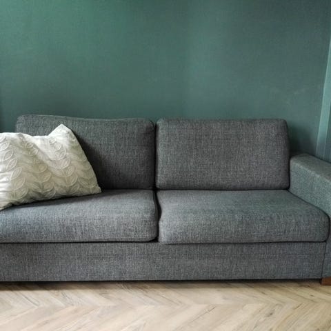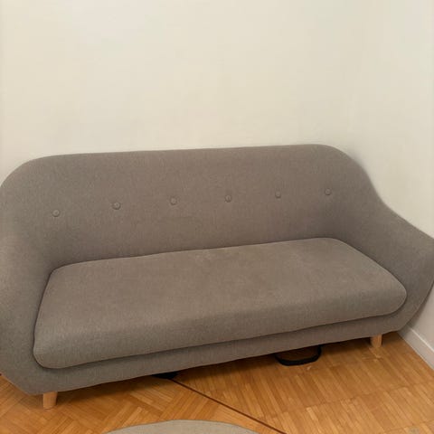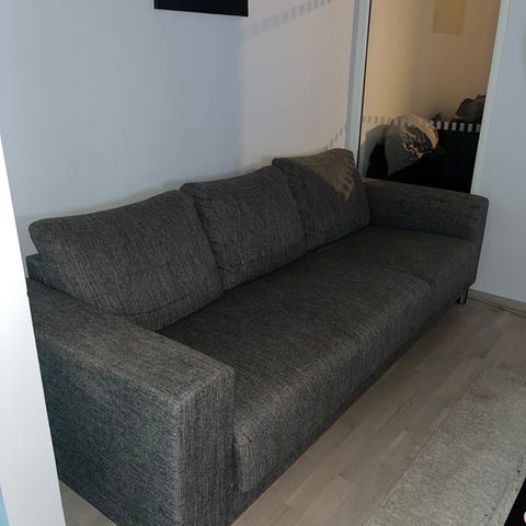 Jysk sohva harmaalla kankaalla. Kolmen istuttava sohva, jossa on pehmustettu istuinosa ja selkänoja. Sohva sopii olohuoneeseen tai muuhun oleskelutilaan.