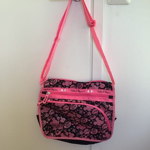 Mikki Hiiri tekonahkainen pieni olkalaukku. Väri vanha roosa?, myytiin pinkkinä, mutta sitä ei väri vastaa. Korkeus 19cm ja leveys kapeimmillaan 19cm. Kankainen olkahihna. Tilattu temusta.