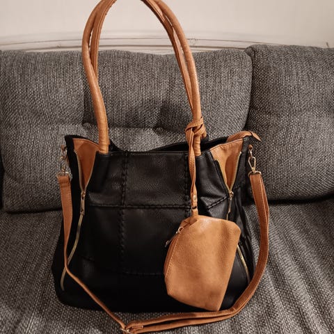 Nahkainen naisten käsilaukku mustalla krokokuvioidulla pinnalla. Laukussa on kantokahva ja säädettävä olkahihna, metalliset lukitusmekanismit ja suorakulmainen muoto. Lääkärinlaukku mallinen