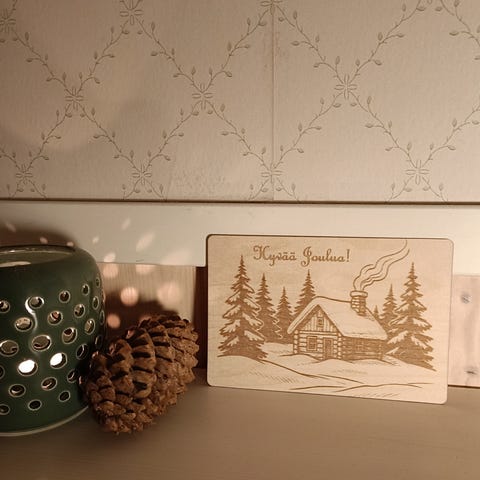 Vanhan mallin mukainen reproduktio joulukortista. Pöydällä pidettävä koristekortti. Pysyy pystyssä takasiivekkeen vuoksi.
