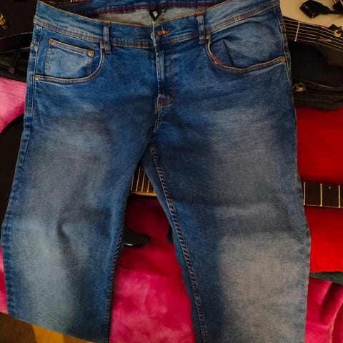 Kivat farkut joiden lahkeessa vetoketjut ja polvissa reiät. Koko on 33 ja merkki mnml, yksi vyötärön nauhoista on katkennut ja saa varmasti korjattua