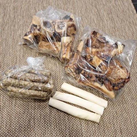 Koiralle erilaisia nahkaluita, paistettuja luita, raakoja putkiluita, raakoja kylkiluita ja paljon kakkapusseja. Lisäksi joitain herkkuja ja kurkkutorvia.
