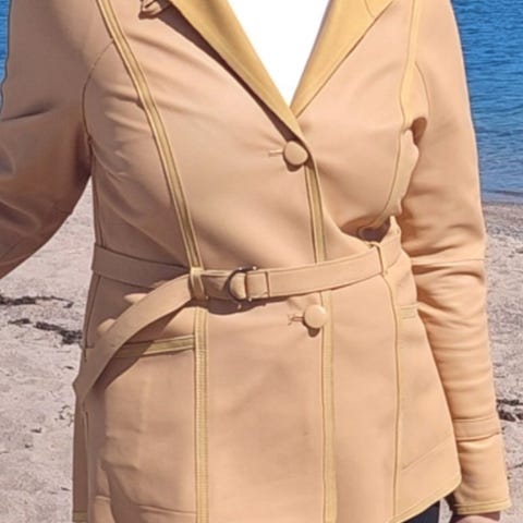 Talvinen nahkatakki karvareunuksilla. Kuvioitu pinta ja mokkanahkanauhasta tehtyjä yksityiskohtia. Koko noin 40-42, kuvissa S kokoisen päällä tarkista mitat