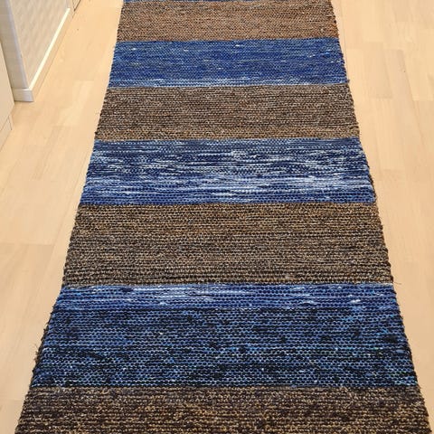 Kangaspuilla kudottu kaunis räsymatto. Käyttämätön, mutta varastossa ollut pidempään, joten vaatinee pesua. Hyvin pitkä, mutta saa poikki haluamansa pituuteen kun leikkaa ja päättelee langat.