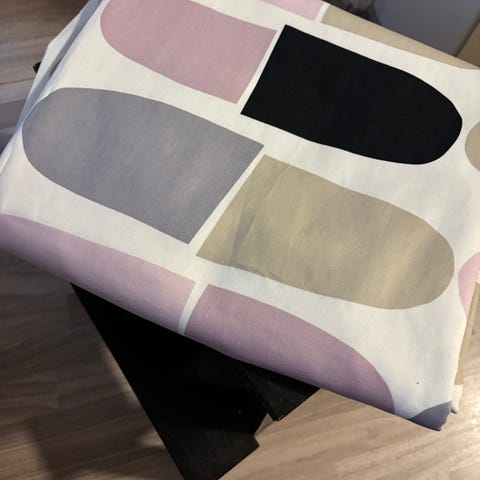 Uusi, käyttämättömäksi jäänyt Maija Isolan suunnittelema Jäätelökesä-kuosinen Marimekon puuvillakangas. Reilu 3 metriä. Värit: poltettu oranssi, mintunvihreä, ja vaaleahko ruskea.