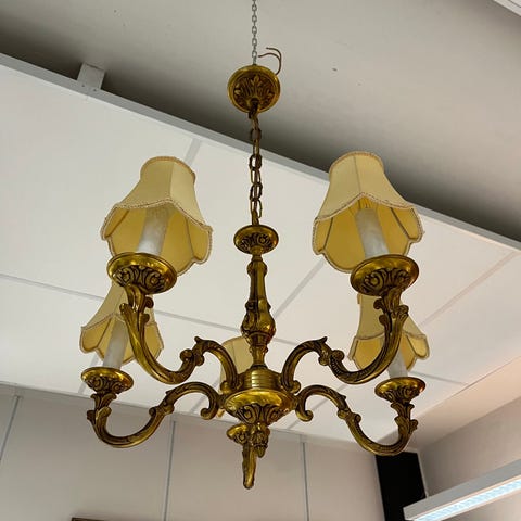 Valkoharjatun kullan värinen 8-lamppuinen kattokruunu. Lampun halkaisija 70cm. Toimiva.