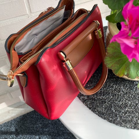 Melkein kuin uusi iso käsilaukku jossa keskellä vetoketjulla oleva osio. Sisäosa kangasta, säädettävä olkahihna