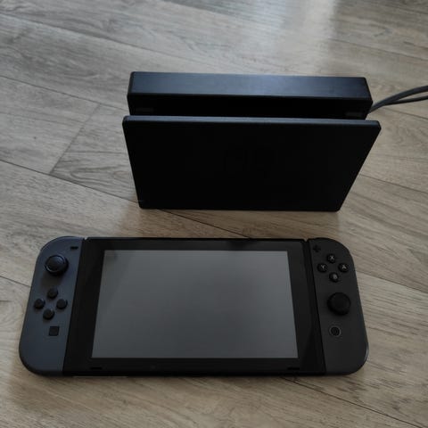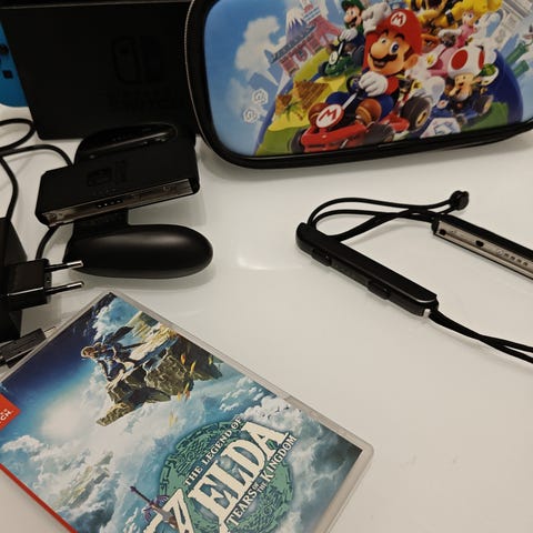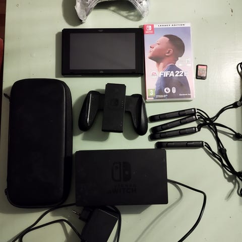 Nintendo Switch -konsoli, jossa on neon sininen ja punainen Joy-Con-ohjain. Mukana konsolin telakka, latauskaapeli ja lisävarusteena Mario-aiheinen langaton ohjain. Lisäksi mukana FIFA 23 Legacy Edition -peli. Konsoli soveltuu sekä pelikonsoliksi että multimedialaitteeksi.
