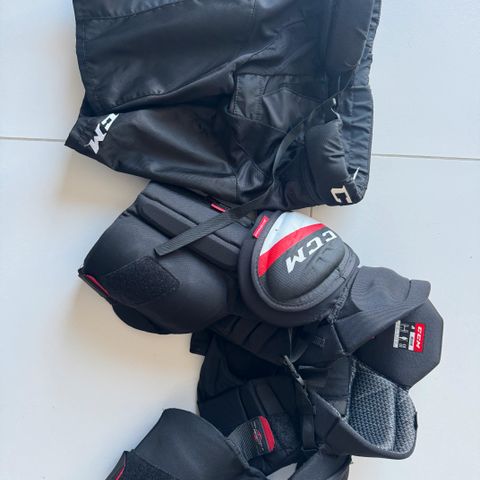 CCM JR Medium jääkiekko housut mustassa värissä, koko 137-147 cm. Bauer Jr. Medium hartiasuojat musta-sinivihreänä. Varusteet sopivat juniorikokoiselle jääkiekkoilijalle.