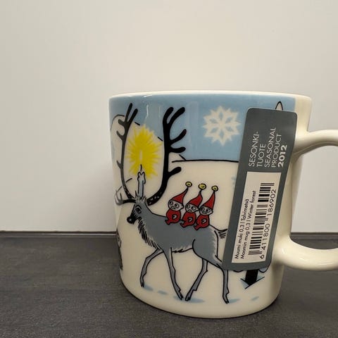 Myydään tarrallinen muumimuki lumileikkejä 2011.
