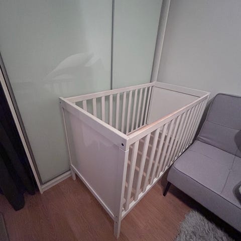 Harmaa Troll merkkinen pinnasänky. Käytön jälkiä näkyy melko paljon. Pieni lohkeama pohjassa, joka ei meillä haitannut käyttöä. Ks. kuvat. Toisen laidan saa laskettua. Meillä ollut käytössä vain ilman toista laitaa.
