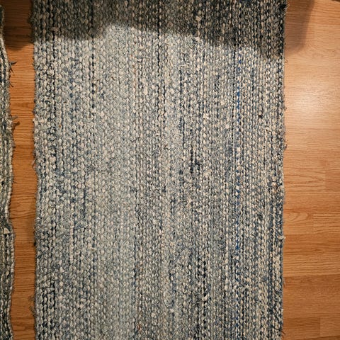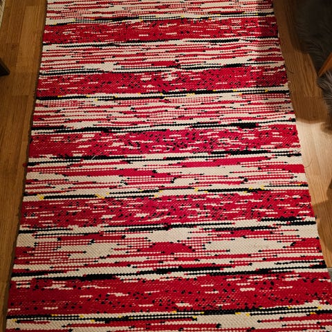 Kangaspuilla kudottu kaunis sininen matto. Ollut pidempään varastossa, mutta ei koskaan lattialla käytössä, joten vaatinee kuitenkin pesua.