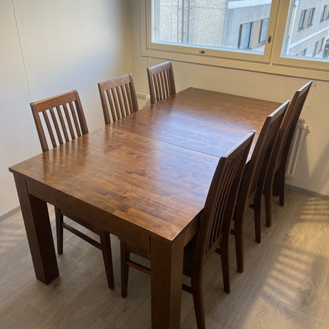 Täyspuu ruokailu ryhmä, jatkettava pöytä + 6 tuolia