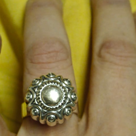 Kalevala Koru hopeinen pallohela sormus. Koko 17.25. Valmistusvuosi 1967. Sisäpuolella kaiverrus 24.12. 1968 ja nimenä ehkä Sirkka.