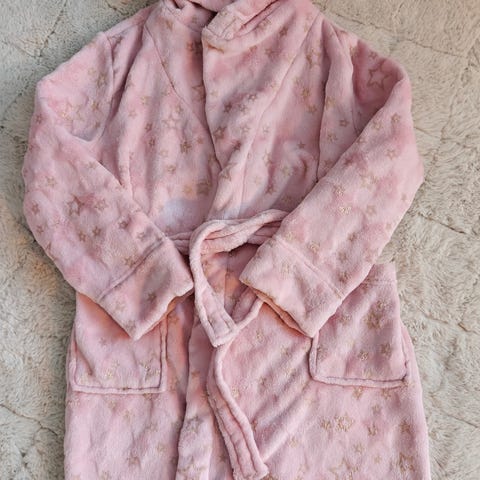Persikan värinen ehkä vähän vaaleanpunaiseen vivahtava, ihanan pehmeä aamu/kylpytakki. Koko 140cm.