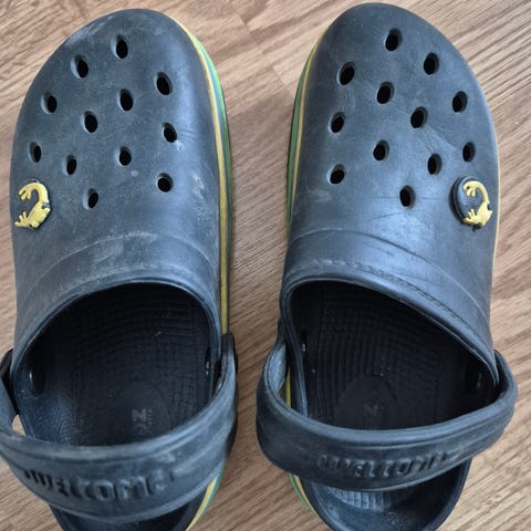 Crocs lasten sandaalit unisex-mallisia, sinisen värisiä. Kengät ovat muovimateriaalia ja niissä on rei'itetty päälliosa ilmanvaihtoa varten.