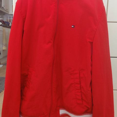 Tommy Hilfigerin punainen,hupullinen takki. Taskuissa nepparikiinnitys.