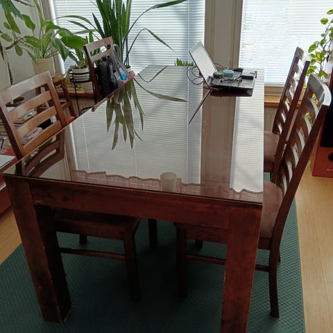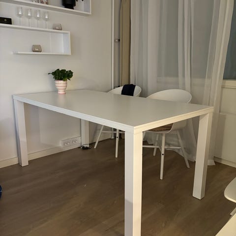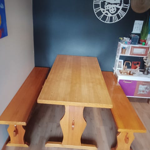 Annetaan ruokailuryhmä, iso täysipuinen Pöytä ja kuusi tuolia. Hinta 0€. Pinnassa pientä kulumaa. Saa tarjota