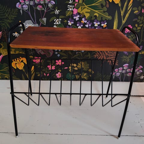 Ehjä, upea vintage lehtiteline. Alkuperäis punoksilla ja muovi jalkatassuilla. Metallissa iän tuomaa kulumaa toki on, mutta mielestäni kuuluu asiaan. Yleis ilmeeltään tosi siisti. Arviolta 60-luku. Kevyt, mutta tukeva teline.