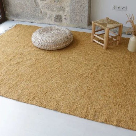Näyttävä sinapinkeltainen matto, jossa yhdistyy luonnonläheinen tunnelma ja käsityön ainutlaatuinen jälki.