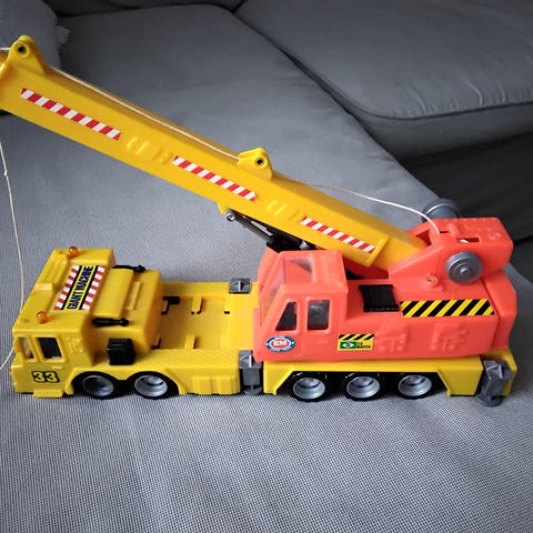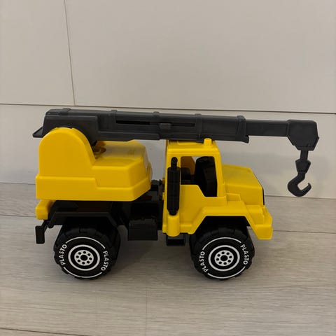 Nosturiauto, josta painellessa kuuluu ääniä. Sininen valo vähän rikki, mutta ei haitanne leikkimistä.