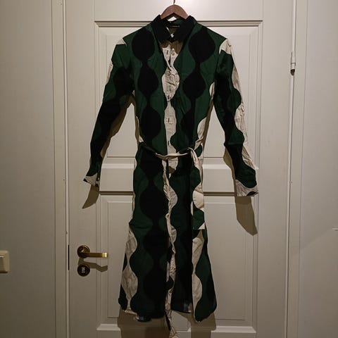 Uniqlon Marimekko-malliston kauluspaitamekko, pesty kerran ja sen jälkeen säilytetty kaapissa - kunto siis uusi. Taskut, vyötäröllä nauha, reiluhko mitoitus. Värit ruskea, valkoinen ja tummansininen.