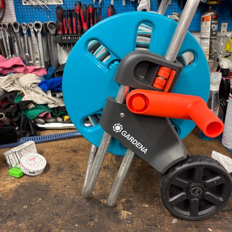 Toimiva ja siistikuntoinen letkukärry, letkuvaunu, puutarhaletkuvaunu.