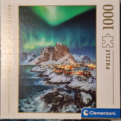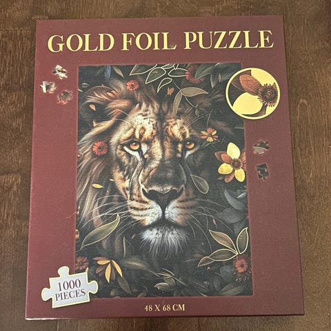 Annetaan palapeli. En ole tehnyt tätä palapeliä kokonaan, joten en tiedä onko kaikki palat. Yksi huonokuntoinen pala ainakin mukana. Palojen seassa joitakin kissankarvoja.