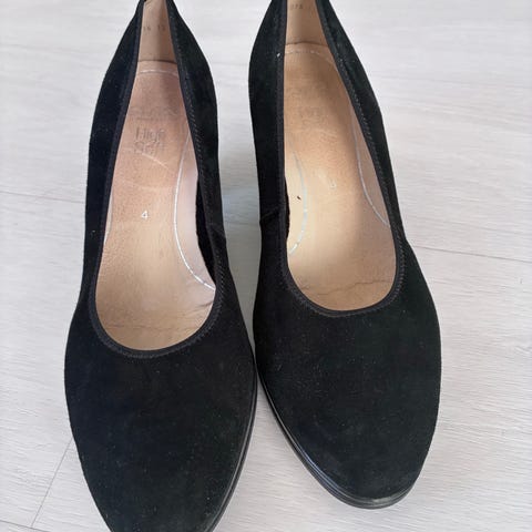 Päällinen mokkanahkaa, kauniit nahkakoristenauhat, miellyttävä pehmustettu pohjallinen, korko 6cm, koko 6. Pinnassa paikoin pientä kulumaa, säilytyksestä hieman lyttääntyneet, korkolaput todella hyvässä kunnossa.
