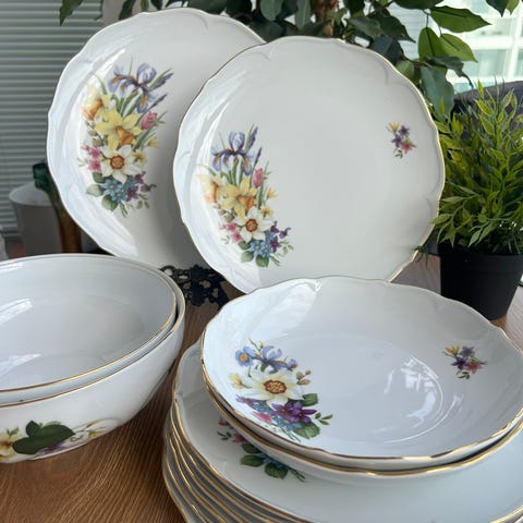 Upea ja harvinainen Rosenthal Sanssouci -astiasto, valmistettu Saksassa 1940-luvun lopulla, US Zone Germany -leimalla.