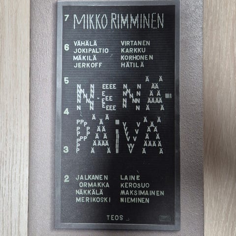 Myydään Mikko Rimmasen kirja Nenäpäivä. Hauska ja omaperäinen suomalainen teos, joka yhdistää nykyrunoutta ja tarinallisuutta. Täydellinen lahjaksi tai omaan lukemistoon. Erittäin hyväkuntoinen kirja, mutta ainoa moite on, että ensimmäinen tyhjä sivu on irroitettu kirjasta (katso kuvat).