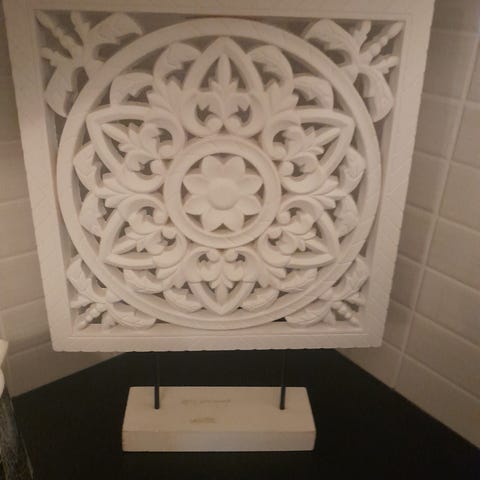 Puinen ja valkoiseksi maalattu mandala näköeste ikkunan eteen tai lipaston päälle koristeeksi
